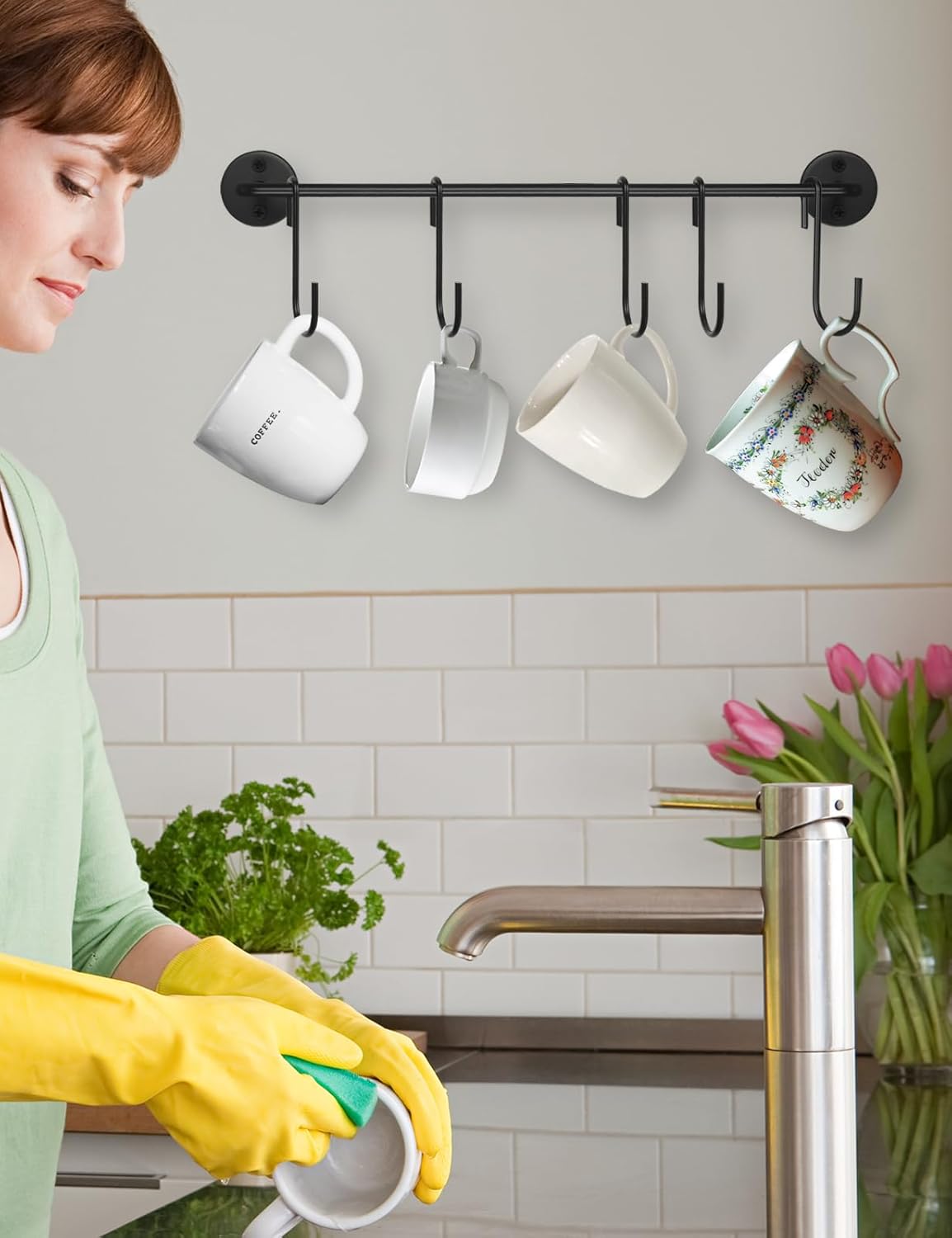 Ein großer Vorteil dieses Tassenhalters ist seine Platzersparnis. Durch die Wandmontage wird wertvoller Thekenraum frei, der für andere Küchenartikel oder Vorbereitungen genutzt werden kann. In einer kleinen Wohnung oder Küche, in der Platz oft zur Mangelware wird, ist dies ein erheblicher Pluspunkt. Zudem wird die Unordnung durch das Aufhängen der Tassen signifikant reduziert.