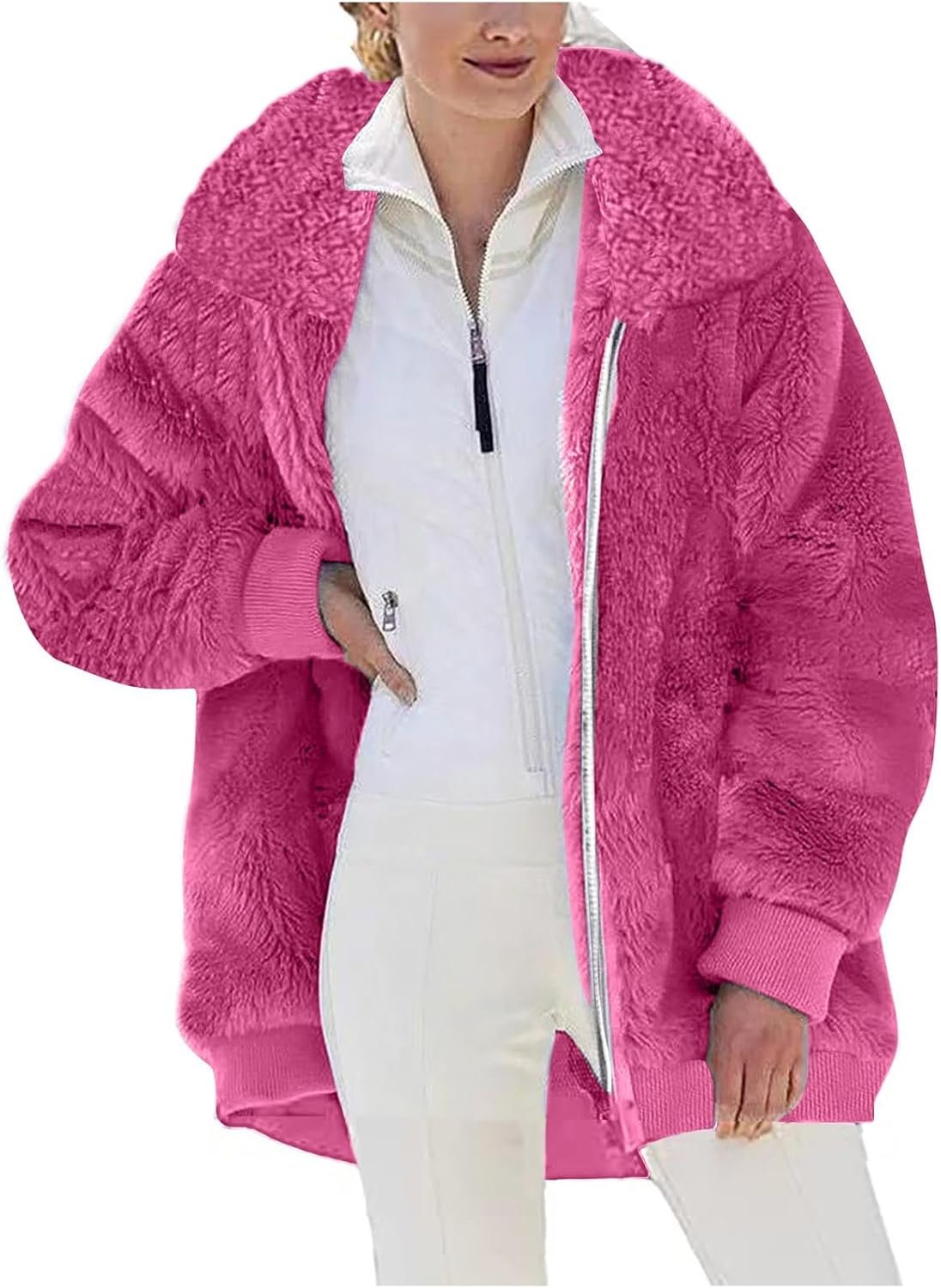 CSHE Fleece Jacket Women’s Warm Comfortable Winter Jacket with Pockets Lapels Sweat Jacket Warm Autumn Winter Coat Teddy Fleece Jacket Zip Plush Jacket Women Double-Sided Winter Clothing Fleece