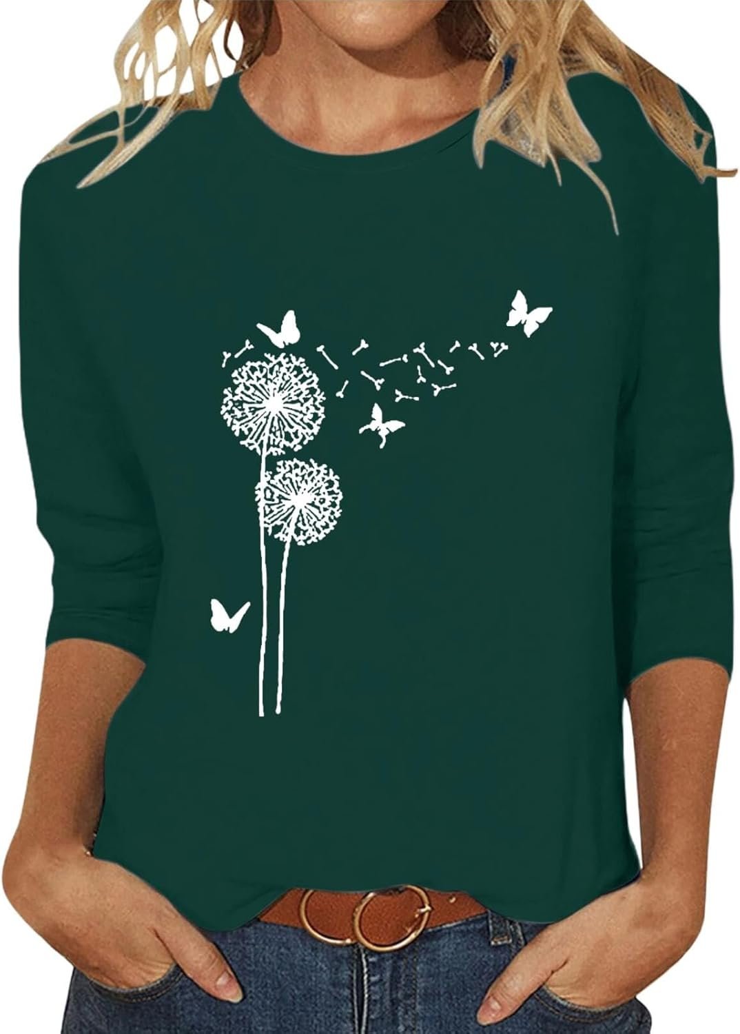 HOOUDO And Women’s Slim Fit T-Shirt 3/4 Sleeve Long Shirt Summer Casual Top Cotton Lightweight Tunic Stylish Round Neck Wrap Dandelion Pattern Summer Shirt Women’s Sports Shirt Blouses