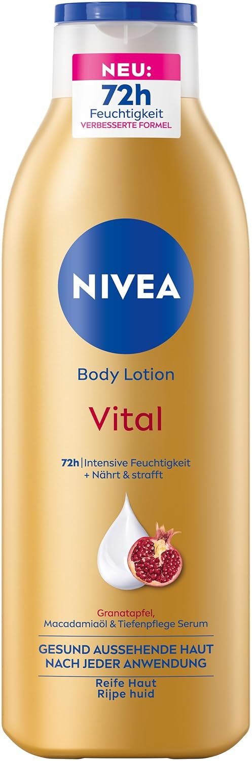 NIVEA Body Lotion Vital, Nourishing Body Cream for Mature Skin with Pomegranate, Macadamia Oil & NIVEA Deep Care Serum, Skin Cream for 72 Hours of Intensive Moisture (250 ml)